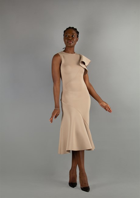 Asymmetric Cut Frill Shoulder Scuba Dress - Beige