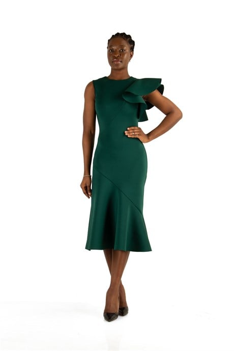 Asymmetric Cut Frill Shoulder Scuba Dress - Emerald Green