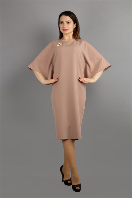 Batwing Plain Big Size Dress With Brooch Detail - Mink