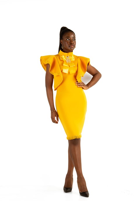 Bowknot Bow High Neck Ruffle Shoulder Scuba Dress - Yellow
