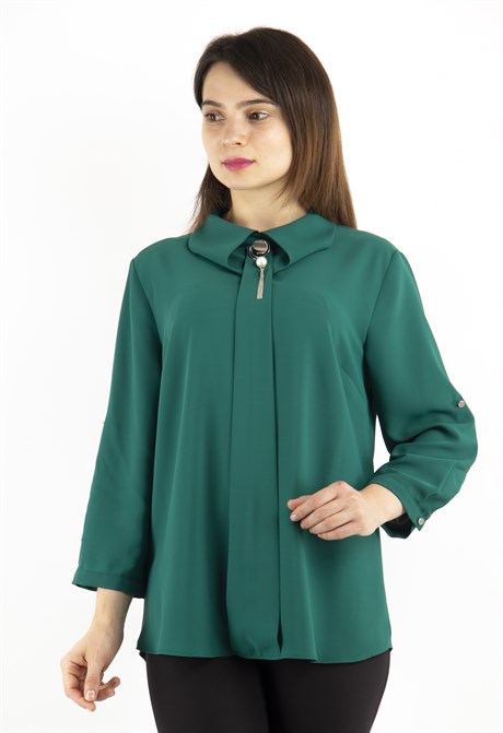 Collar Brooch Detail Big Size Blouse - Emerald Green