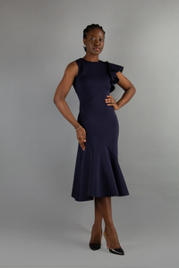 Asymmetric Cut Frill Shoulder Scuba Dress - Navy Blue