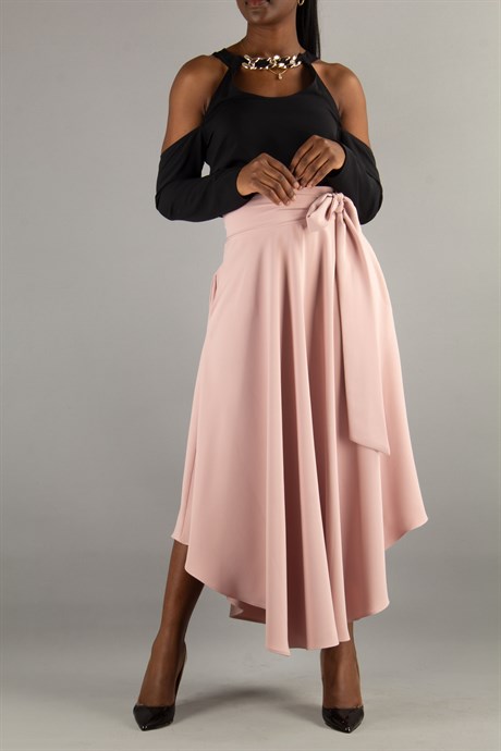 High Waisted Flared Asymmetric Skirt With Belt - Powder