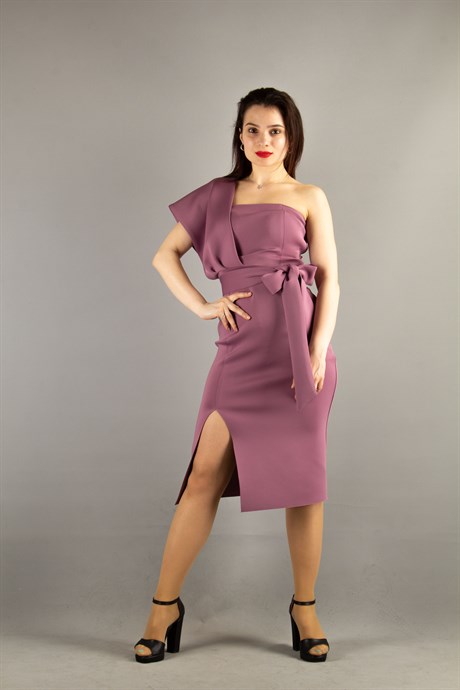 One Shoulder Scuba Dress With Matched Belt - Rusty Rose
