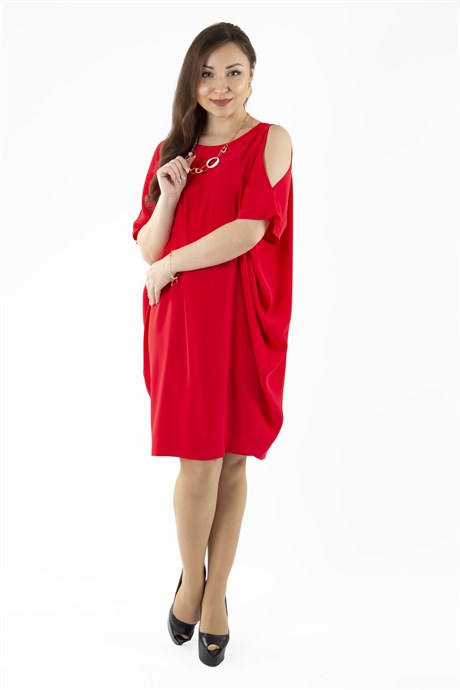 Sexy Tied Crew Neck Cold Shoulder Batwing Short Sleeve Plain Big Size Mini Dress - Red