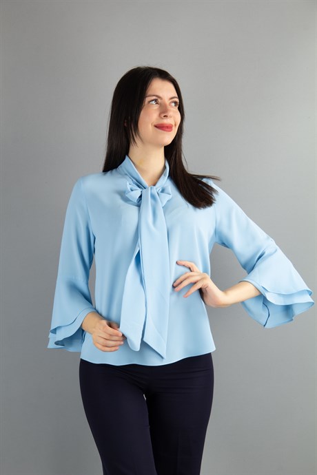 Tie Neck Bell Sleeves Big Size Blouse - Baby Blue