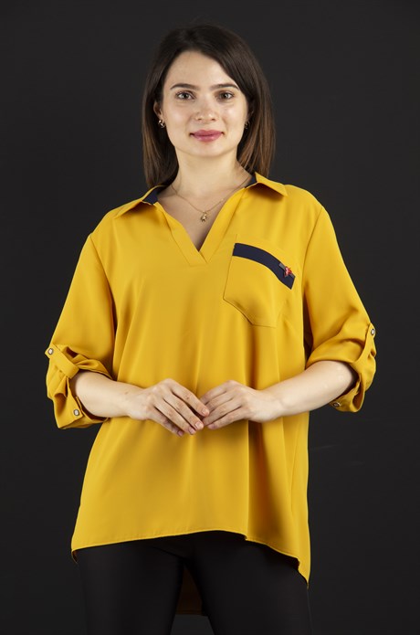 V Neck Big Size Blouse With Brooch Detail - Mustard